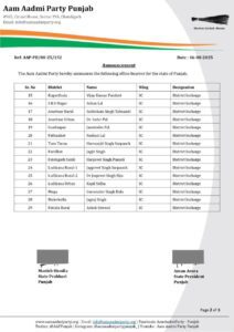 The names of 39 office bearers of the Aam Aadmi Party’s Punjab SC wing have been made public, in accordance with the list made public by the party’s state president, Aman Arora, and Punjab affairs in-charge, Manish Sisodia.