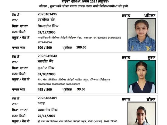Coming next, Manvir Kaur from SS Memorial Senior Secondary Public School, Kamoana (Ferozepur), also from the science stream, and Arsh, a humanities student from Sri Tara Chand Vidya Mandir Senior Secondary School, Bhikhi (Mansa), scored 498 out of 500 (99.6%) marks. Their ranks were decided based on their age difference, as both had the same score.