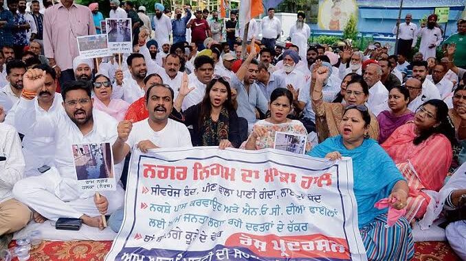 Today, Congress leaders held a protest outside the Jalandhar Municipal Corporation headquarters. They raised strong slogans against the Punjab Government and the Corporation blaming them for the city’s ongoing problems.
