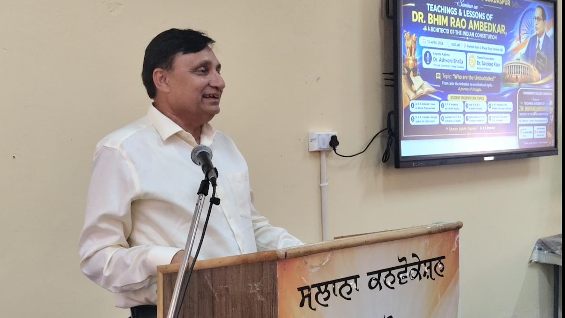 ਗੁਰਦਾਸਪੁਰ,13 ਅਪ੍ਰੈਲ – ਸਰਕਾਰੀ ਕਾਲਜ ਗੁਰਦਾਸਪੁਰ ਵਿਖੇ ਡਾ. ਭੀਮ ਰਾਓ ਅੰਬੇਡਕਰ ਦੀ ਜਯੰਤੀ ਬੜੀ ਸ਼ਰਧਾ ਅਤੇ ਉਤਸ਼ਾਹ ਨਾਲ ਮਨਾਈ ਗਈ। ਇਹ ਸਮਾਗਮ ਕਾਲਜ ਦੇ ਪ੍ਰਿੰਸੀਪਲ ਡਾ. ਅਸ਼ਵਨੀ ਕੁਮਾਰ ਭੱਲਾ ਦੀ ਅਗਵਾਈ ਹੇਠ ਕਰਵਾਇਆ ਗਿਆ, ਜਿਸਦਾ ਮੁੱਖ ਉਦੇਸ਼ ਵਿਦਿਆਰਥੀਆਂ ਨੂੰ ਡਾ. ਬੀ. ਆਰ ਅੰਬੇਡਕਰ ਜੀ ਦੇ ਵਿਚਾਰਾਂ ਅਤੇ ਉਨ੍ਹਾਂ ਦੇ ਸਮਾਜਿਕ, ਸਿੱਖਿਆਤਮਕ ਅਤੇ ਸੰਵਿਧਾਨਕ ਯੋਗਦਾਨ ਬਾਰੇ ਜਾਗਰੂਕ ਕਰਨਾ ਸੀ।