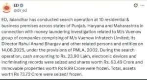 Ten homes and commercial buildings in Punjab, Haryana, and Maharashtra were raided by the Jalandhar Enforcement Directorate on August 14, 2025. The Bunaud Group of companies, which includes Bunaud Infratech Limited, its director Rahul Anand Bhargava, and other related individuals, was the target of this money laundering effort. In accordance with the Prevention of Money Laundering Act of 2002, the raid was carried out. The ED found various incriminating documents, electronic equipment, and cash totalling ₹23.90 lakh during the search. Property valued at ₹9.99 crore and shares valued at ₹63.49 crore were also frozen. A total of 73.72 crore worth of assets were subject to action.