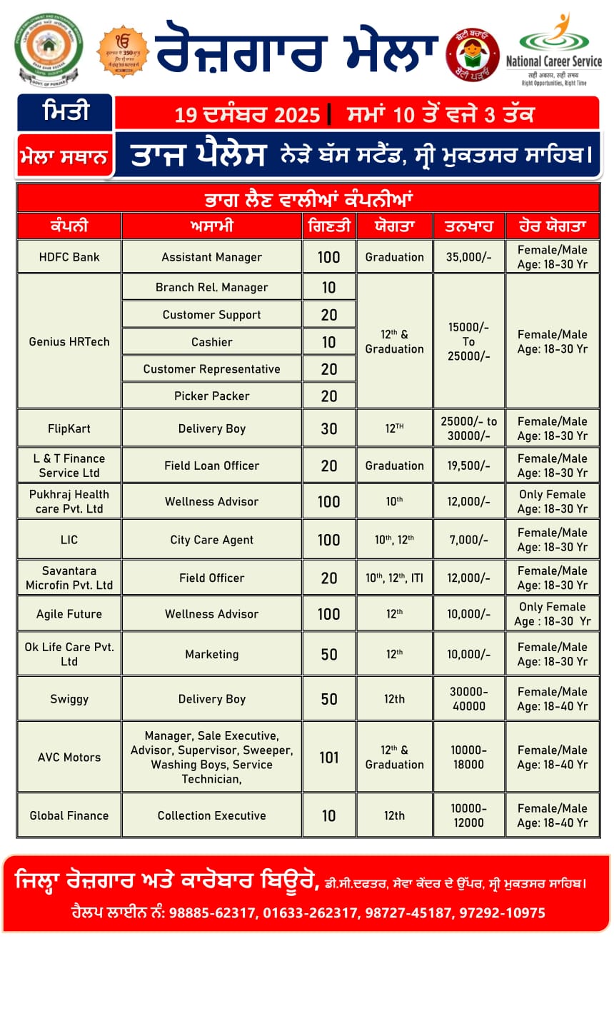 ਵਧੇਰੇ ਜਾਣਕਾਰੀ ਲਈ ਪ੍ਰਾਰਥੀ ਜ਼ਿਲ੍ਹਾ ਰੋਜ਼ਗਾਰ ਅਤੇ ਕਾਰੋਬਾਰ ਬਿਊਰੋ, ਸ੍ਰੀ ਮੁਕਤਸਰ ਸਾਹਿਬ ਦੇ ਨੰਬਰ 98885-62317 ’ਤੇ ਸੰਪਰਕ ਕਰ ਸਕਦੇ ਹਨ।