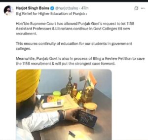 a landmark Supreme Court ruling that gives the Punjab government relief in relation to the hiring of 1158 assistant professors and librarians. The court has granted the government’s appeal to guarantee the continuity of education for students in government colleges by permitting existing appointments to continue until a new hiring procedure is established. Harjot Singh Bains, the education minister for Punjab, verified this occurrence on social media. The Supreme Court’s ruling, he said, is a “big relief for higher education in Punjab” and guarantees “continuity of education for our students”. In an effort to “save the 1158 recruitment” for good, the Punjabi government is currently submitting a review petition. The administration intends to argue its position “strongly” in court. This shows that the government is taking additional legal actions to secure these jobs and preserve stability in the state’s higher education system, even though the current reprieve is only temporary.