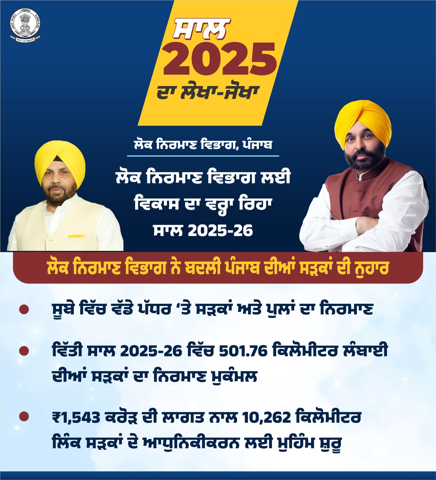 ਮੁੱਖ ਮੰਤਰੀ ਭਗਵੰਤ ਸਿੰਘ ਮਾਨ ਦੀ ਅਗਵਾਈ ਵਾਲੀ ਪੰਜਾਬ ਸਰਕਾਰ ਵੱਲੋਂ ਸੂਬੇ ਨੂੰ ਰੰਗਲਾ ਪੰਜਾਬ ਬਣਾਉਣ ਦੀ ਦਿਸ਼ਾ ਵਿੱਚ ਅਤੇ ਇਸ ਦੇ ਸਰਬਪੱਖੀ ਵਿਕਾਸ ਲਈ ਲਗਾਤਾਰ ਯਤਨ ਕੀਤੇ ਜਾ ਰਹੇ ਹਨ। ਇਸੇ ਲੜੀ ਤਹਿਤ ਪੰਜਾਬ ਸਰਕਾਰ ਦੇ ਲੋਕ ਨਿਰਮਾਣ ਵਿਭਾਗ ਵੱਲੋਂ ਸੂਬੇ ਦੇ ਬਾਸ਼ਿੰਦਿਆਂ ਲਈ ਬਿਹਤਰੀਨ ਸੜਕੀ ਨੈਟਵਰਕ ਮੁਹੱਈਆ ਕਰਵਾਉਣ ਲਈ ਲਗਾਤਾਰ ਕੰਮ ਕੀਤਾ ਜਾ ਰਿਹਾ ਹੈ।